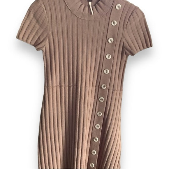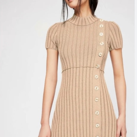 Free People Lottie Mod Ribbed Sweater Dress. Latte color. Aline silhouette, button detail down the front, ribbed knit. Great with boots, tights, or however you want to wear it. Size xs. Good used condition.