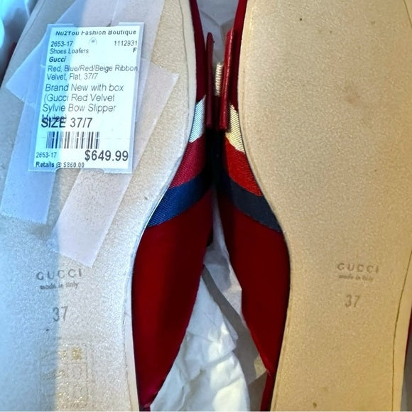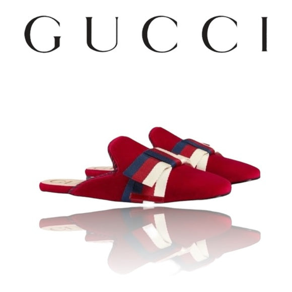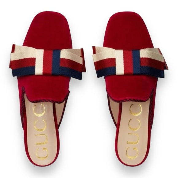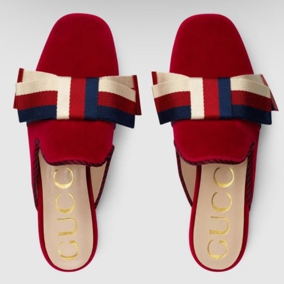 Shop the Velvet slipper with Sylvie bow by Gucci. The slipper continues to be an influential accessory, depicted in a variety of fabrics, forms and designs. Made in plush velvet with twisted piping, this style features an oversized Sylvie Web bow. Comes with a box but no dust covers Protective covering placed over the bottom of the shoe to prevent damage to shoe when wearing