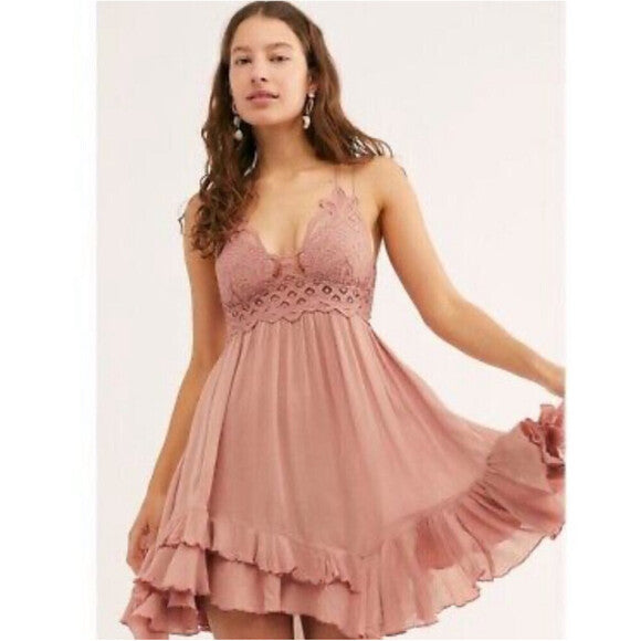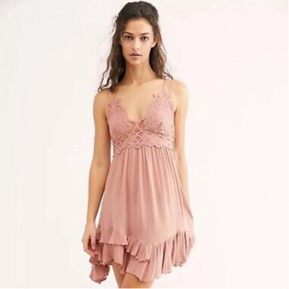 A slip dress with a little extra romance. This Free People dress feels easy-sweet with a delicate lace bodice and a breezy, handkerchief hem.