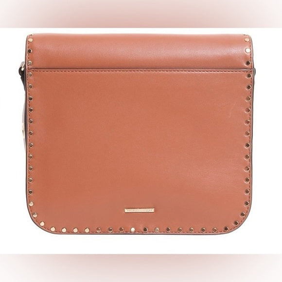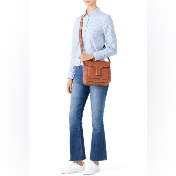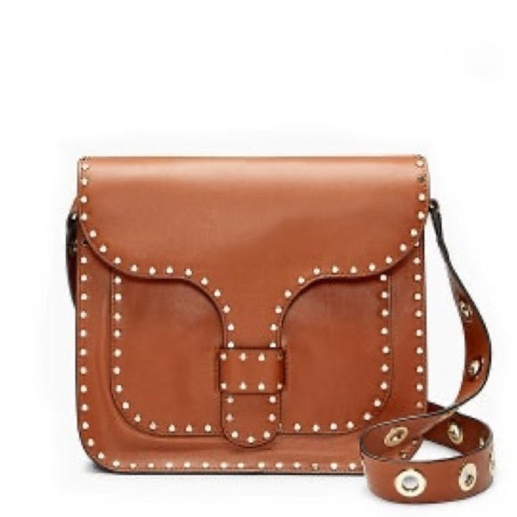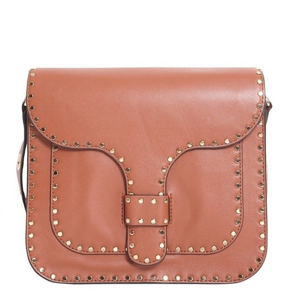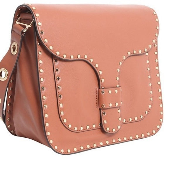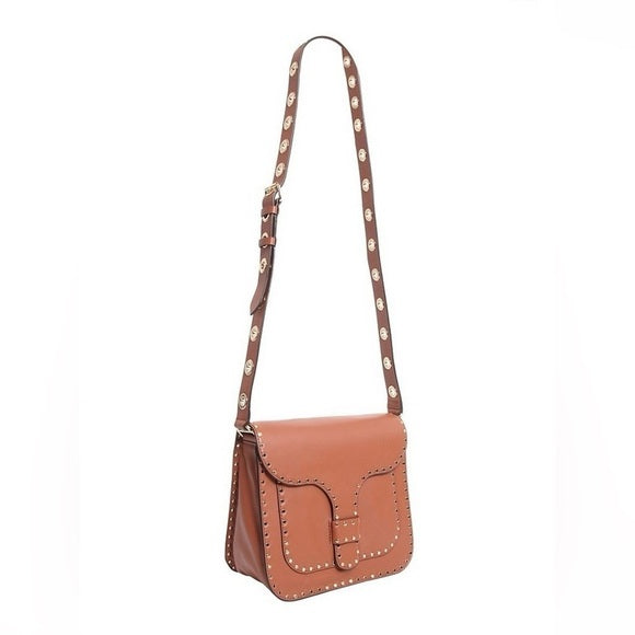 Adjustable crossbody strap with buckle, flap closure, adorned with metal studs and eyelets, one front and back slit pocket, internal: three credit card slots, one slit and one zip pocket, gold colored metal hardware, cotton lining, size: 22 x 22.5 x 12.5 cm