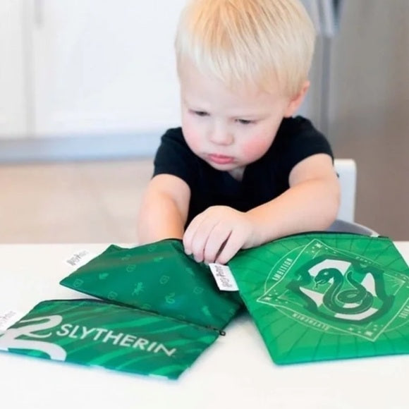 Brand new Bumkins x Harry Potter Slytherin snack bags set. Comes with 3 bags in total. Eco-friendly alternative to single-use plastic baggies The set includes 2 snack bags (7”x3.5”) and 1 sandwich bag (7”x7”) Made from the easy-wipe waterproof fabric Smooth zipper closure contains crumbs Single-ply construction means no worrying about icky stuff growing between layers of fabric Machine washable and dishwasher-safe (top rack) for easy cleaning BPA, PVC, vinyl, phthalate and lead free Great for food or fun, snack bags help organize lunches, toys, electronics, cosmetics and more