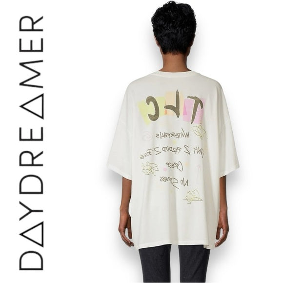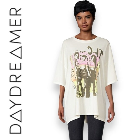 No introduction needed — the ultimate 90’s trio, TLC, hits Daydreamer's latest oversized tee designed with scanned images of the three icons with their stage names stamped near their portraits. Fun fact: TLC is an acronym for the three members' names. Featuring their signature singles handwritten on the back and accented in pastel neons, this is sure to be a smash hit for girl group fans.