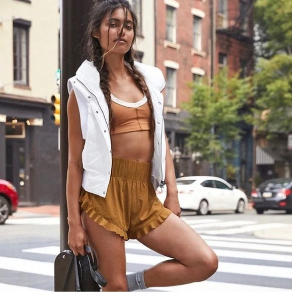 Add a little flair to your run with these performance-ready, light-as-air high-rise shorts featuring a frilly, ruffled trim perfect for layering with spandex or bike shorts.