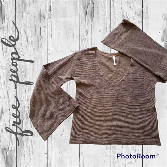 Item Description: This boxy Free People sweater is detailed with narrow ribbing throughout. Dramatic bell sleeves. V neckline.