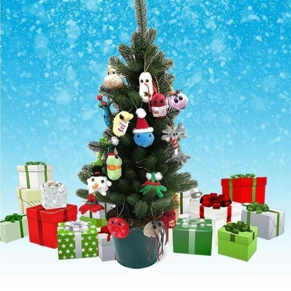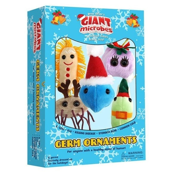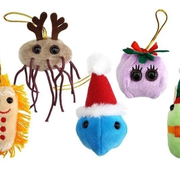 5 germs festively dressed up for the holidays! Decorate your tree or house with these memorable special edition microbes with golden loops for hanging.