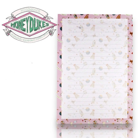 HONEYDUKEST™? We've got you covered with the HONEYDUKES™ Notepad. This bubble gum pink notepad is covered in sweets and treats straight from HONEYDUKEST™; EXPLODING BON BONST™, HONEYDUKES™ Lollipops, BERTIE BOTTS EVERY FLAVOUR BEANST™, CHOCOLATE FROGST™ and CAULDRON CAKEST™.