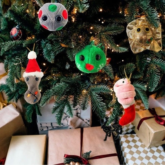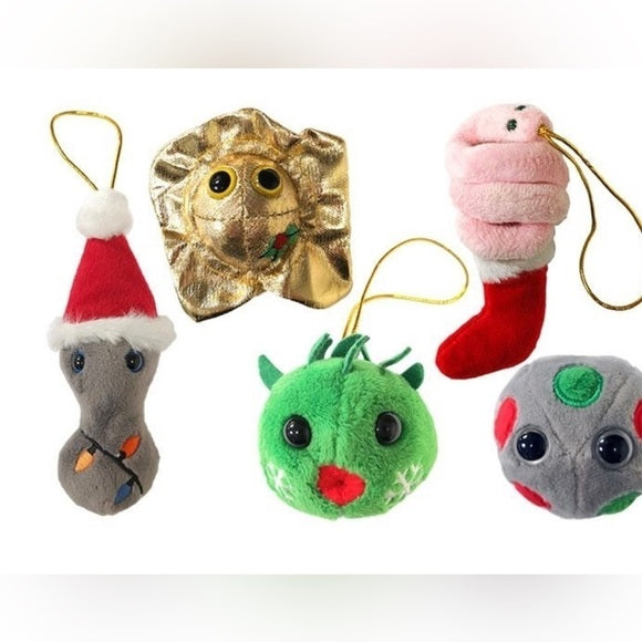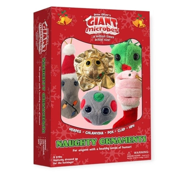 5 STDs festively dressed up for the holidays! Decorate your tree or house with these memorable special edition microbes with golden loops for hanging.