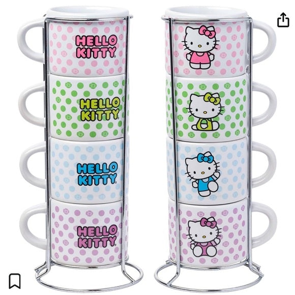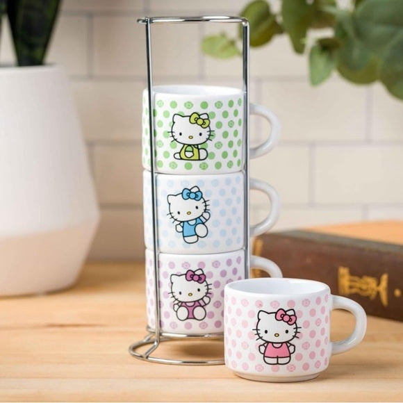 4 PIECE SET: This set includes 4 playful polka dot mugs (85g each) in pink, green, blue and purple. All designed with a graphic Hello Kitty face. The set also includes a metal rack, perfect for stacking and organizing your cups for easy cleaning.