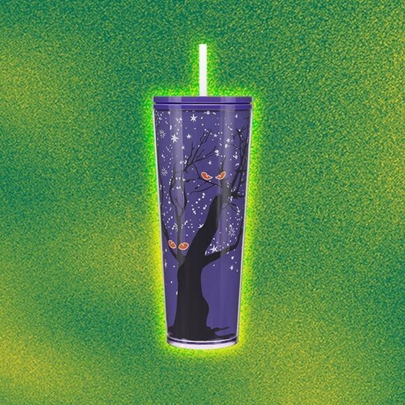 Sets of eyes peek through the branches of a tree on this purple cold cup, adding a dash of mystery to the day’s cup of coffee.
