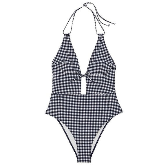 A sexy plunging neckline is perfectly balanced with a sweet gingham print and tie-front detail.