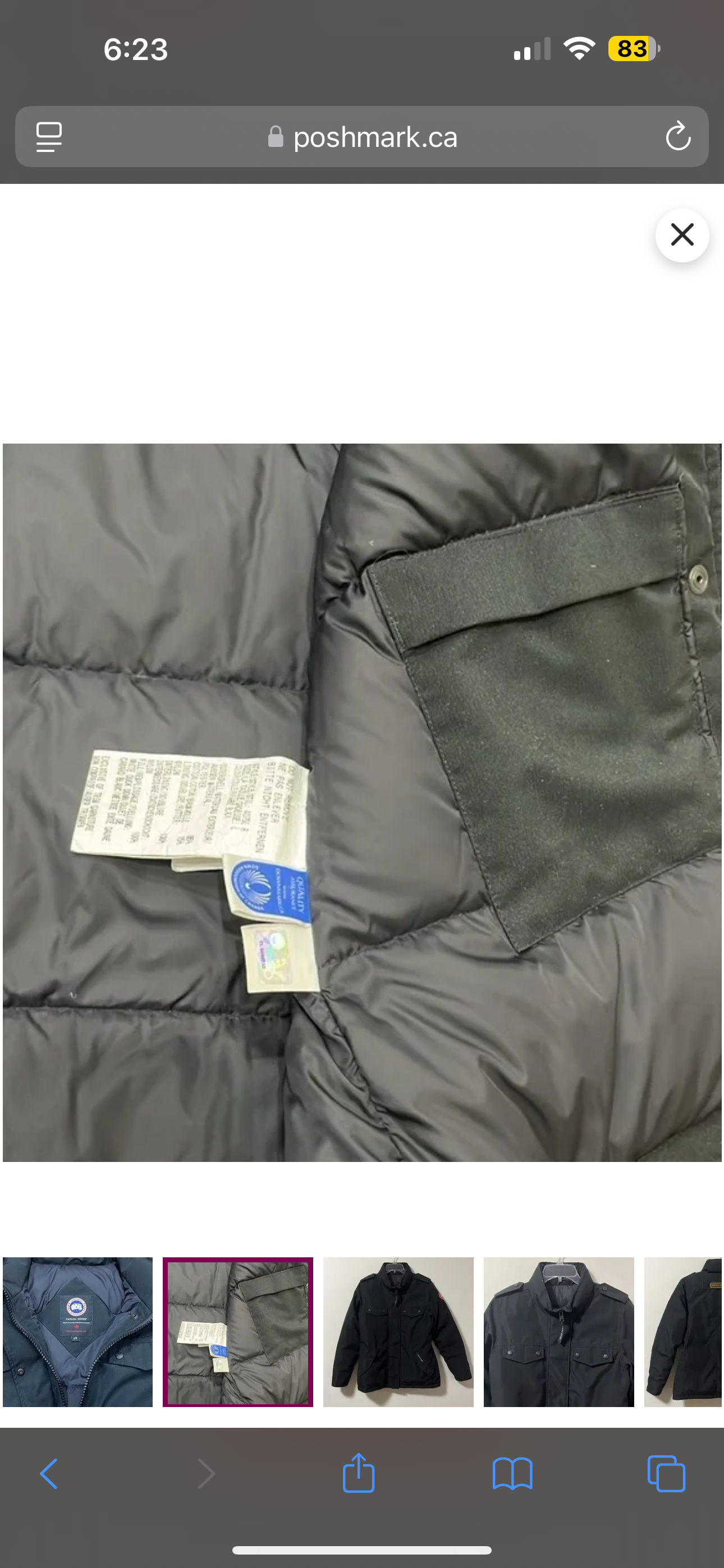 This authentic Canada Goose Burnett military-inspired jacket brings style and premium warmth to an otherwise unbearable winter. This down jacket provides maximum warmth without the bulk of comparable down jackets. The hip-length Burnett has a slim fit that allows for maximum mobility. Hand warmer pockets are perfectly located at the hip and are fleece lined for added comfort. The jacket has a durable, water resistant, shell that provides shelter from the elements. - 800 Fill Power White Duck Down - Hip-length for mobility - Two lower hand warmer pockets with hidden snap closure - Heavy-duty, center-front YKK two-way locking zipper, secured with hidden snaps - Two chest drop-in pockets with Canada Goose logo on snap closure - Interior shoulder straps allow to carry like a backpack when out of the elements - Shoulder epaulettes with snap attachment - Interior security pocket with zipper closure - Interior drop-in pocket with additional stretch media pocket with headphone access opening - Recessed heavy-duty rib-knit cuffs Outer Shell: Polyester 85% / Cotton 15% Lining: Nylon 100% Colour: Black Size: Large Approx pit-to-pit 22”, shoulder to hem 27.5”, sleeve inseam 21” NEW, unworn
