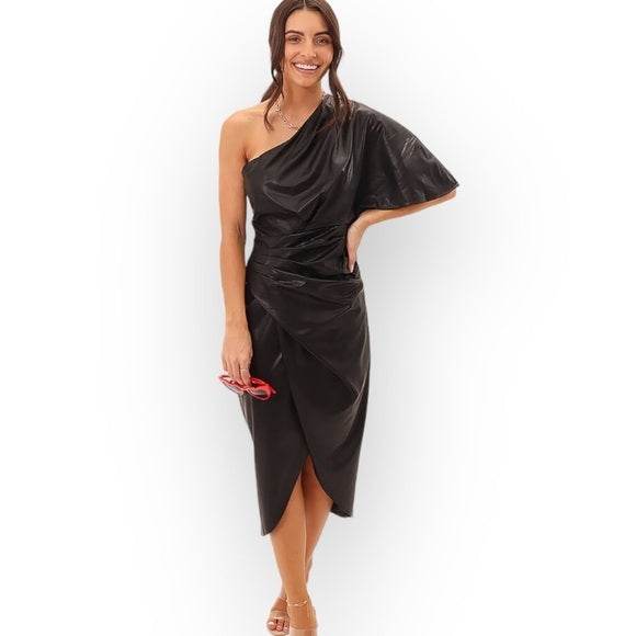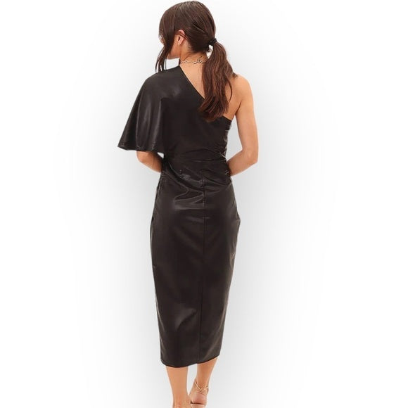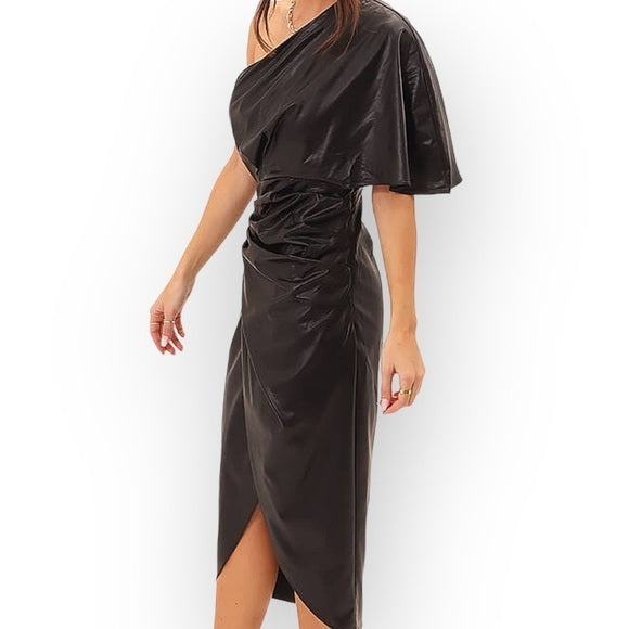 Plan your next night out with our Greenwich Dress! Featuring a one shoulder design with ruched detailing, a tulip hem, and faux leather fabrication. This edgy midi is perfect to wear with your favorite earrings and strappy heels for this season's events.