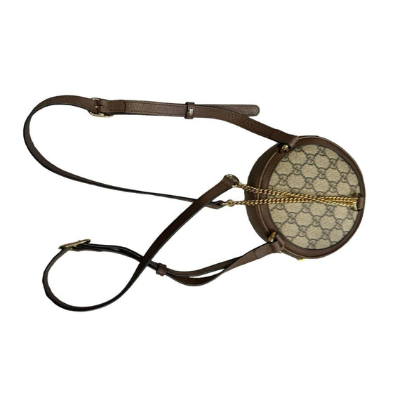This pre-owned Gucci Ophidia mini backpack is a stylish addition to any women's wardrobe. The exterior is made of beige canvas with the iconic Gucci GG pattern and brown leather accents on the handle and straps. It features a spacious interior lined in brown with a zippered pocket for added organization.